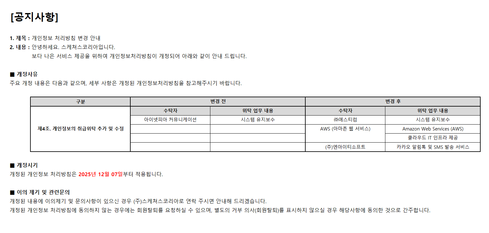 [공지사항] 개인정보 처리방침 변경 안내