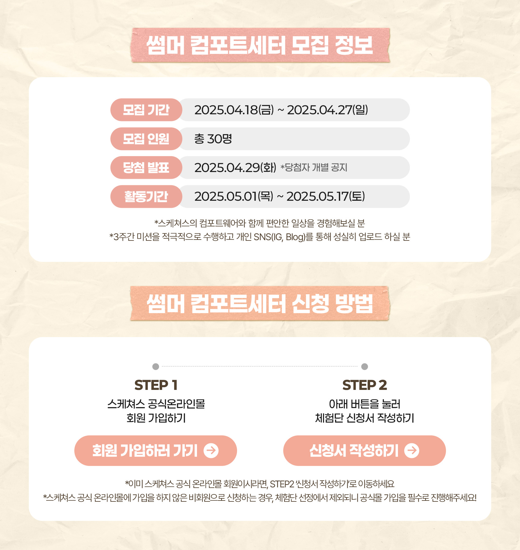 고객센터 고객지원 자주 묻는 질문 공지사항 이벤트 1:1 문의 멤버십 혜택 매장찾기 공지사항 [마감] 25SS 스케쳐스 어패럴 썸머 체험단, 컴포트세터 30명 모집 2025.04.18 목록