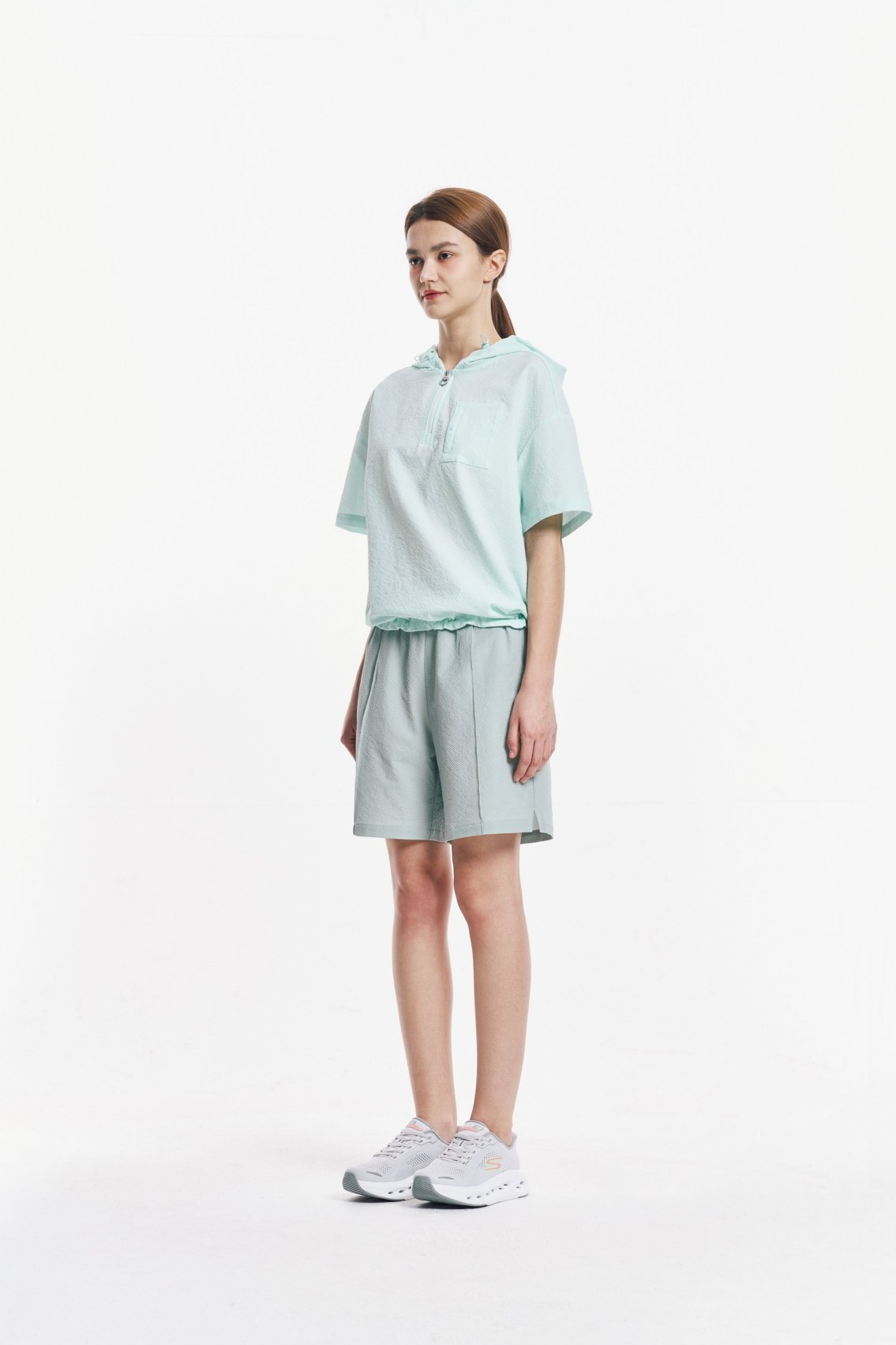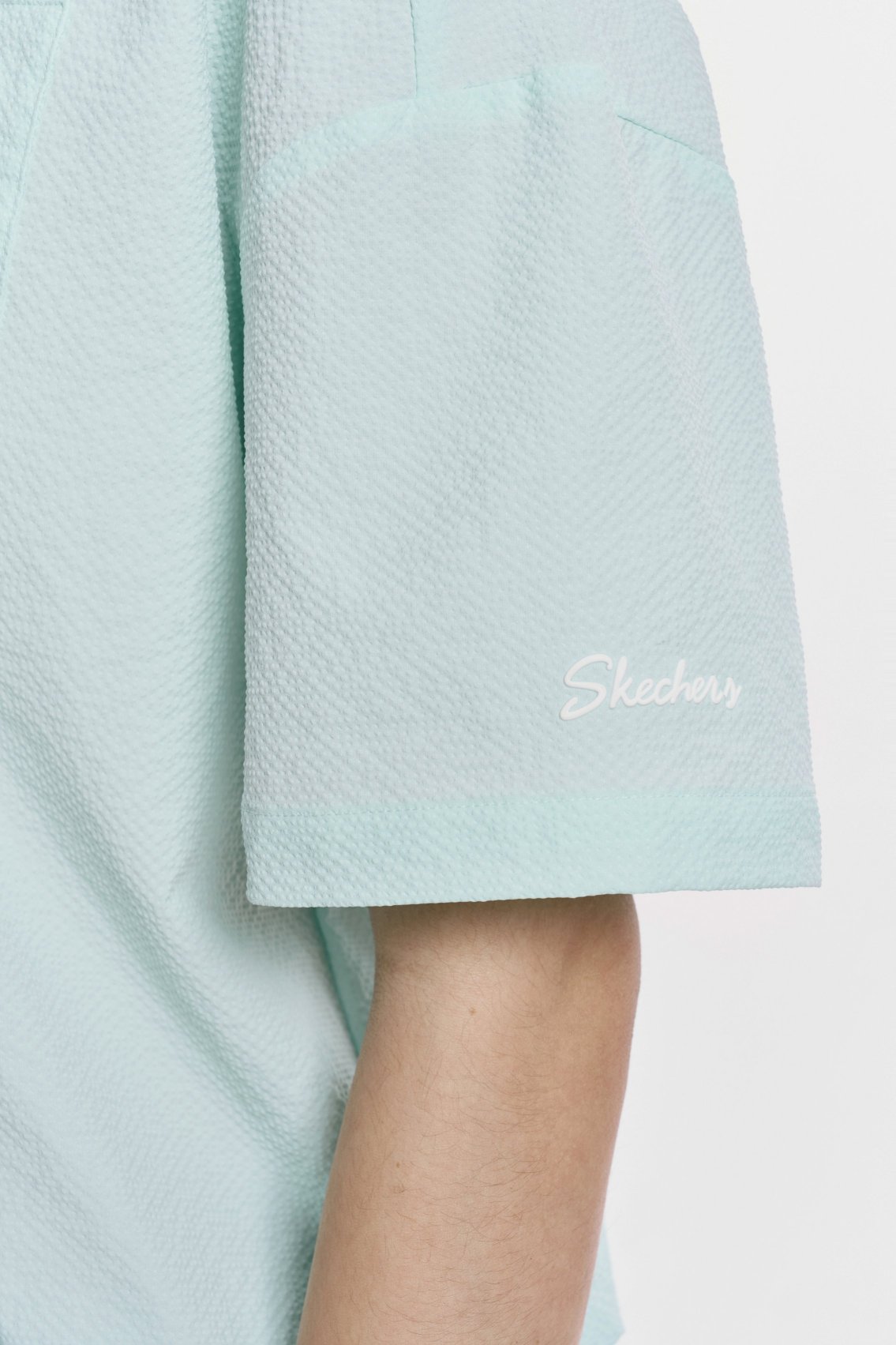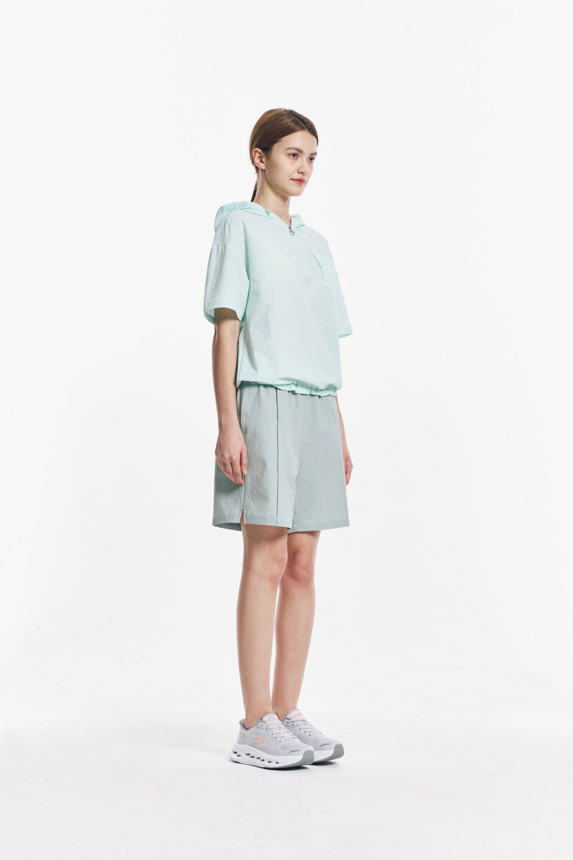 [스케쳐스 어패럴] 여성 시티 시어서커 반팔 후드 티셔츠